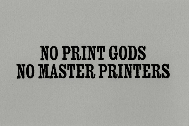 No Print Gods No Master Printers, Letterpress, 4″ x 6″, 2023