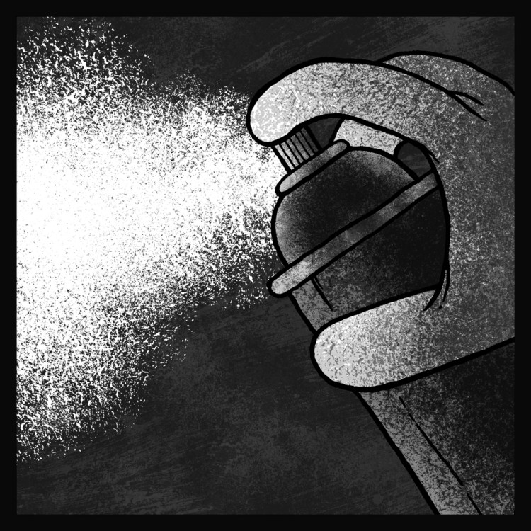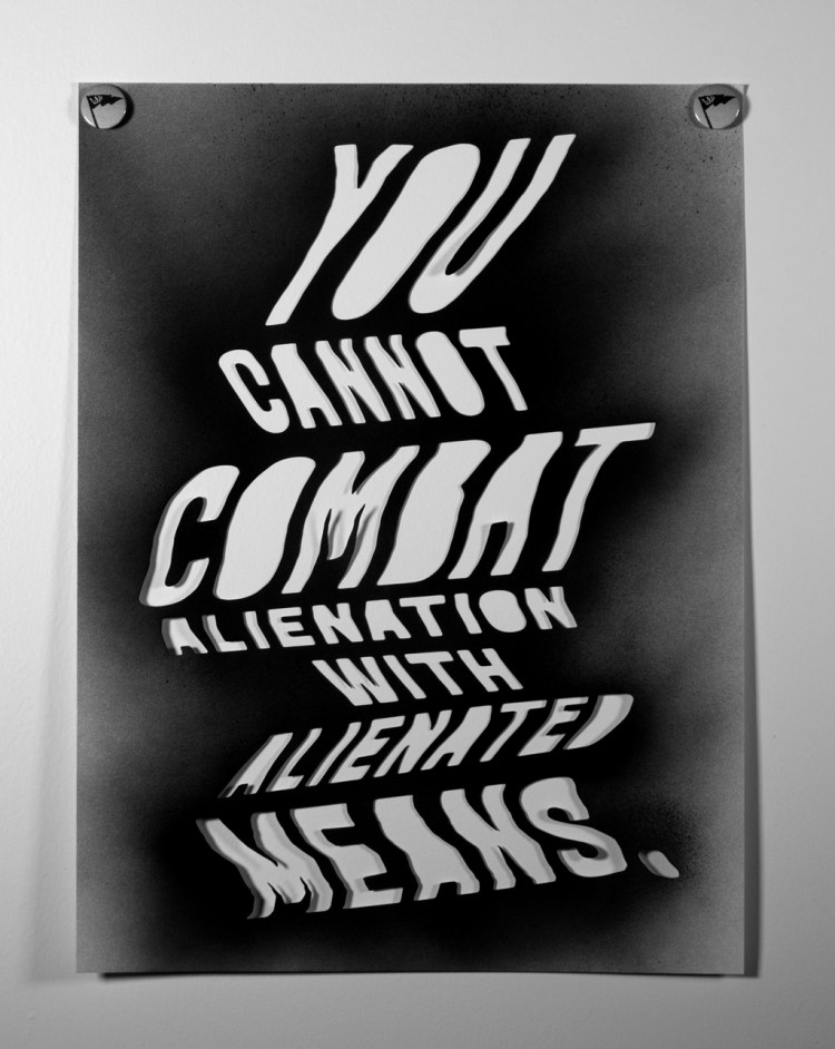 you cannot combat alienation with alienated means, spray paint on laser cut paper with inkjet buttons, 24” x 18”, 2021